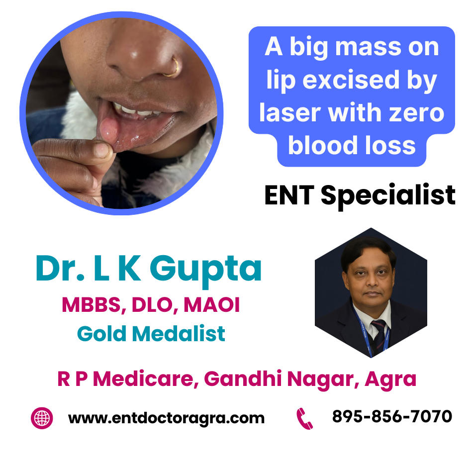 This case study highlights the successful laser excision of a large lip mass performed at R P Medicare – Super Speciality ENT Hospital, Agra, under the expert care of Dr. L K Gupta (MBBS, DLO, MAOI), Gold Medalist ENT Surgeon. The procedure was carried out using advanced laser surgical techniques, resulting in precise removal with almost zero blood loss, minimal discomfort, and excellent cosmetic healing.
